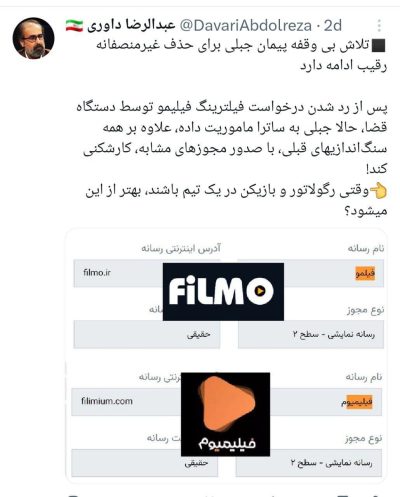 🔹عبدالرضا داوری نوشت: تلاش بی وقفه پیمان جبلی برای حذف غیرمنصفانه رقیب ادامه دارد؛ پس از رد شدن درخواست فیلترینگ فیلیمو توسط دستگاه قضا، حالا جبلی به ساترا ماموریت داده، علاوه بر همه سنگاندازیهای قبلی، با صدور مجوزهای مشابه، کارشکنی کند! 🔹وقتی رگولاتور و بازیکن در یک تیم باشند، بهتر از این میشود؟