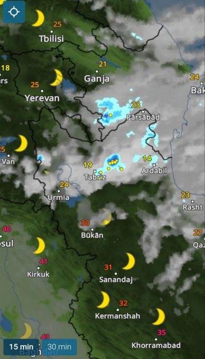 🔹تبریز و اردبیل با دمای زیر ۲۰ درجه زیر رگبار باران است. 🔹 گرگان و مازندران هم درحال بارندگی با دمای حدود ۲۵ درجه هستند. 🔹همزمان جنوب کشور هم با دمای بالاتر در حال بارندگی است.