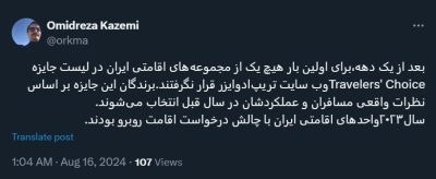 یک فعال حوزه گردشگری: بعد از یک دهه، برای اولین بار هیچ یک از مجموعههای اقامتی ایران در لیست جایزه Travelers’ Choice وب سایت تریپادوایزر قرار نگرفتند