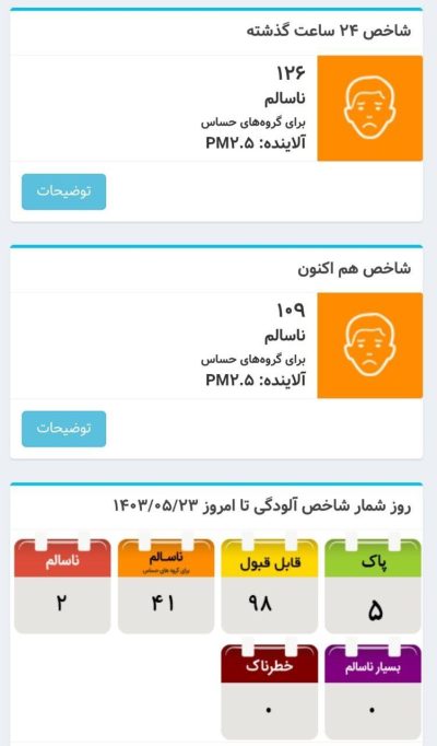 🔹شاخص کیفیت هوا با قرار گرفتن روی شاخص ۱۰۹ و وضعیت نارنجی قرار گرفته و شاخص آلودگی هوا افزایش یافته لذا هوای تهران برای گروههای حساس جامعه آلوده است.