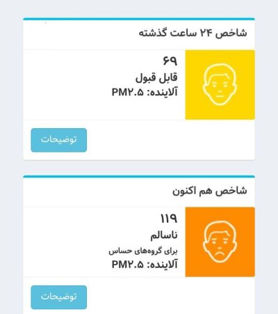 🔹 بر اساس اعلام شرکت کنترل کیفیت هوای تهران، شاخص کیفیت هوا در حال حاضر بر روی عدد ۱۱۹ قرار گرفته و هوای تهران در وضعیت نارنجی و برای گروههای حساس جامعه آلوده است.