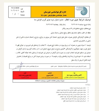 🔹 اداره کل هواشناسی خوزستان نسبت به تداوم استقرار توده هوای گرم و افزایش دما وقوع دمای ۴۸ و ۴۹ درجه و بالاتر از دوشنبه تا پنجشنبه هفته جاری هشدار سطح نارنجی صادر کرد.