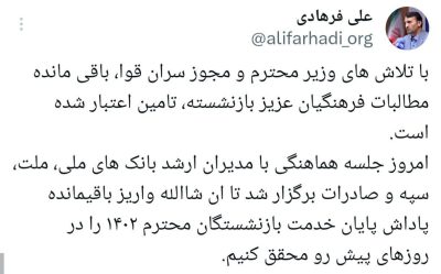 🔹سخنگوی وزارت آموزش و پرورش از قریب الوقوع بودن پرداخت پاداش پایان خدمت بازنشستگان ۱۴۰۲ خبر داد!