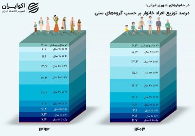 🔹سهم کودکان زیر یک سال در هرم جمعیتی ایران از ۰.۶ درصد در سال ۱۳۹۳ به ۰.۴ درصد در ۱۴۰۲ کاهش یافته، درحالیکه سهم سالمندان ۷۱ سال به بالا از ۴.۵ به ۶.۳ درصد رسیده است.