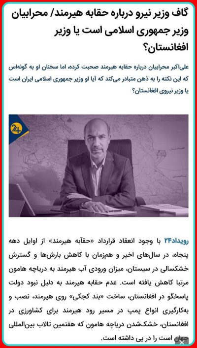 وزیر نیرو درباره حقآبه هیرمند گفته «همکاران ما بازدیدی از ایستگاه آبسنجی دهراود هیرمند صورت دادند. این بازدید نشان داد خشکسالی در افغانستان نیز جدی است و بهتر است که اطلاعات تکمیلی را وزارت امور خارجه بدهد.» هر چند محرابیان به پیگیری حقابه تأکید کرد، ولی بدون اشاره به جزئیات سخنانش درباره خشکسالی در افغانستان…