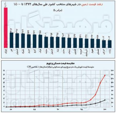 رشد قیمت زمین در شهر تهران: بیش از ١١٠٠ برابر رشد قیمت زمین در ٢٠ شهر منتخب: میانگین ٣٠٠ برابر رشد قیمت دلار در بازار آزاد: ١۴٣ برابر رشد قیمت سکه: ٧٢٧ برابر 🔹 طبق بررسیهای انجام شده تورم زمین در دو دهه اخیر بیشتر از تورم مسکن بوده است. این بازدهی عجیبوغریب زمین در…