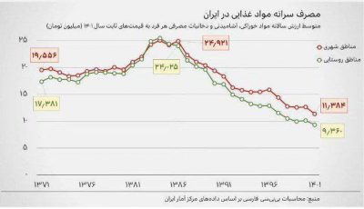 نیمنگاهی به نمودار مصرف سرانه مواد غذایی در ایران! 🔹شیب منفی مصرف سرانه موادغذایی از سال ۱۳۸۶ تا ۱۴۰۱