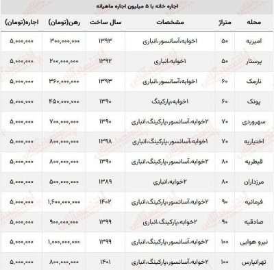 اجاره خانه در تهران با پرداخت ماهیانه ۵ میلیون تومان چقدر پول پیش میخواهد؟