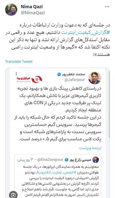 نیانگذار علیبابا و رئیس انجمن تجارت الکترونیک تهران: 🔹در جلسهای که به دعوت وزارت ارتباطات درباره گزارش کیفیت اینترنت داشتیم، هیچ عدد و رقمی در مقابل استدلالهای گزارش ارائه نشد و تنها به ذکر این نکته اکتفا شد که «گیمرها از وضعیت اینترنت راضی هستند»