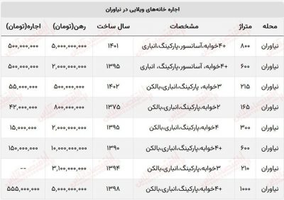 اجاره خانههای ویلایی در نیاوران با قیمتهای نجومی/ از رهن ۱۰ میلیاردی تا اجاره ۵۵۵ میلیونی!