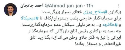 احمد جانجان کارشناس اقتصادی نوشت: 🔹برکناری سلاح ورزی خطای بسیار بزرگیست! 🔹برای سرمایهگذار خارجی پلمب رستوران/کافه تا دیجیکالا و طاقچه و… به هر دلیلی سیگنال عدم سرمایهگذاریست! چه رسد به برکناری رئیس اتاق بازرگانی که سرمایهگذار ایرانی را نیز به فکر جلای وطن میاندازد؛ بگذارید اتاق غیرانتفاعی و مستقل بماند!