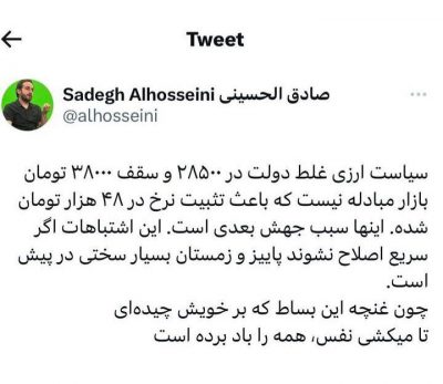 محمدصادق الحسینی، کارشناس اقتصادی، در یادداشتی در فضای مجازی نوشت: 🔹سیاست ارزی غلط دولت در ۲۸۵۰۰ و سقف ۳۸۰۰۰ تومان بازار مبادله نیست که باعث تثبیت نرخ در ۴۸ هزار تومان شده است. 🔹این ها سبب جهش بعدی است. این اشتباهات اگر سریع اصلاح نشود، پاییز و زمستان بسیار سختی در پیش است. 🔹چون غنچه…