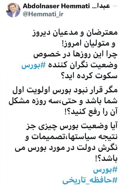 🔹معترضان ومدعیان دیروز و متولیان امروز چرا این روزها در خصوص وضعیت نگران کننده بورس سکوت کرده اید؟!