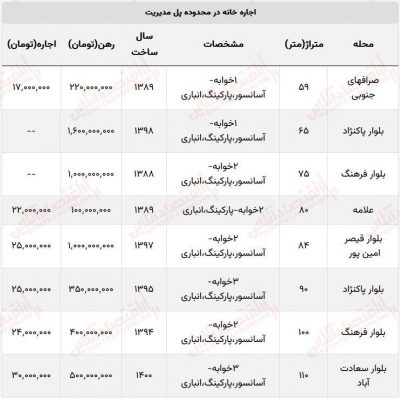 اجاره خانه در محدوده پل مدیریت چقدر آب میخورد؟