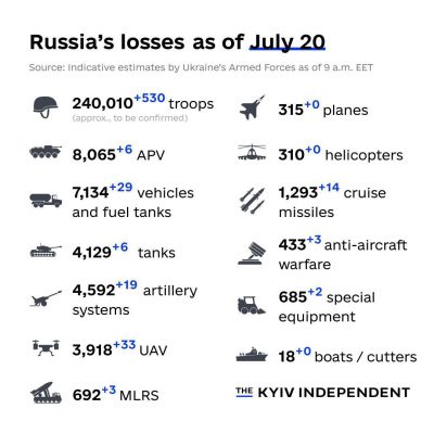 بر اساس گزارش نیروهای مسلح اوکراین، این تصویر تخمینی از خسارات جنگی روسیه تا ٢٠ جولای است.