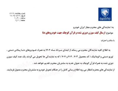 🔹امروز، تصویری در فضای مجازی دست به دست شد که در ایران خودرو، قرار شده روی خودروی دنا، به مشتریان کیف سوزن دوزی و قرآن هدیه دهد. این در حالی است که کیفیت خودرو روز به روز در حال افت است و مشتریان از تمام فرایندهای ثبت نام تا تحویل و کیفیت خودرو شکایت دارند!…