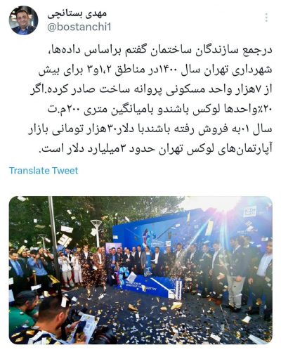 مهدی بستانچی فعال صنعت ساختمان و رییس انجمن تولیدکنندگان سیستمهای تهویه مطبوع ایران نوشت: 🔹درجمع سازندگان ساختمان گفتم براساس دادهها، شهرداری تهران سال ۱۴۰۰در مناطق ۱،۲و۳ برای بیش از ۷هزار واحد مسکونی پروانه ساخت صادر کرده. 🔹اگر ۲۵٪واحدها لوکس باشند و با میانگین متری ۲۰۰میلیون تومان سال ۱۴۰۱ به فروش رفته باشند با دلار ۲۵هزار…