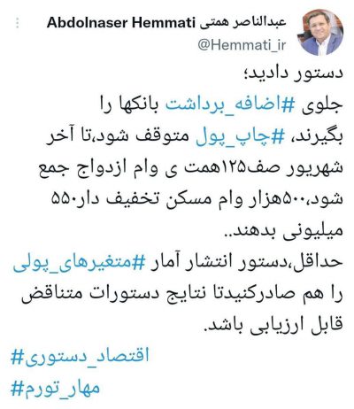 جلوی اضافه برداشت بانکها را بگیرند، چاپ پول متوقف شود،تا آخر شهریور صف۱۲۵همت ی وام ازدواج جمع شود،۵۰۰هزار وام مسکن تخفیف دار۵۵۰ میلیونی بدهند.. حداقل،دستور انتشار آمار متغیرهای پولی را هم صادرکنید تا نتایج دستورات متناقض قابل ارزیابی باشد.