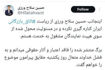 🔹رییس اتاق بازرگانی، صنایع، معادن و کشاورزی ایران که چندی پیش خبر خبرگزاری دولت مبنی بر استعفا را تکذیب کرده بود، خبر استعفای خبرگزاری ایسنا را هم رد و آن را فاقد اعتبار حقوقی دانست. رییس اتاق ایران نوشت: 🔹اینجانب حسین سلاح ورزی از ریاست اتاق بازرگانی ایران کناره گیری نکرده و در مسئولیت محول…