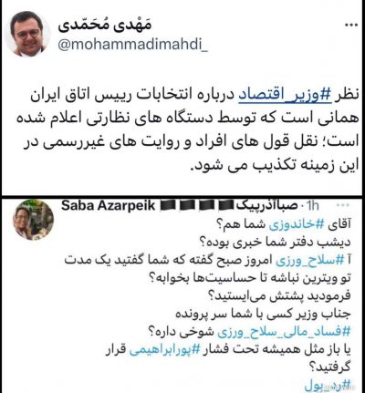 🔹نظر وزیر اقتصاد درباره انتخابات پرحاشیه رییس اتاق بازرگانی و انتصاب سلاحورزی چه بود؟! 🔹رییس مرکز روابط عمومی و اطلاعرسانی وزارت اقتصاد نسبت به توییت یک فعال رسانهای واکنش قاطع نشان داد.