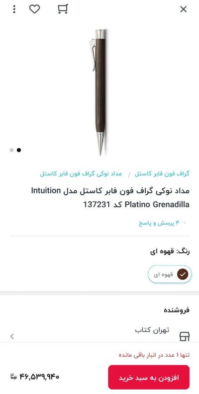 🔹 در حالی که مداد نوکی گراف فون فابر کاستل ۵۰۰ دلار قیمت گذاری شده است اما در فروشگاههای آنلاین داخلی با قیمت حدودا ۴۶ میلیون و پانصد هزار تومانی به فروش میرسد.