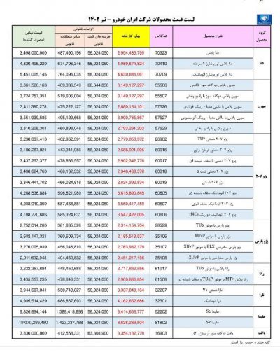 قیمت جدید برخی از محصولات شرکت ایران خودرو در تیرماه ۱۴۰۲ اصلاح و قیمت جدید چند خودرو نیز به آن اضافه شد. شرکت تولیدی ایران خوردو قیمت جدید تیرماه 1402برخی از محصولات خود را که دیروز اعلام کرده بود اصلاح و قیمت جدید چند خودرو را نیز به آن اضافه کرد.
