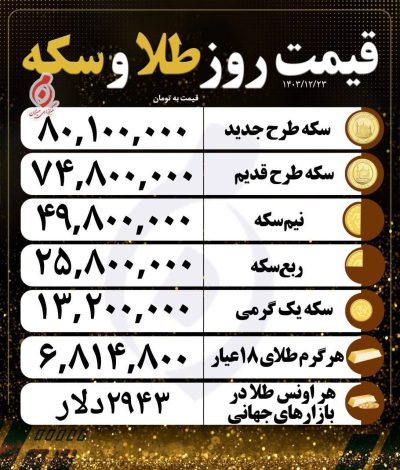 قیمت هر قطعه سکه طرح جدید امروز «۲۳ اسفند۱۴۰۳» ۸۰ میلیون و ۱۰۰ هزار تومان اعلام شد و سکه طرح قدیم به ۷۴ میلیون و ۸۰۰ هزار تومان رسید.