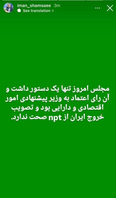 جلسه علنی امروز مجلس با دستور کار بررسی صلاحیت وزیر پیشنهادی اقتصاد برگزار شد و مجلس هیچ مصوبهای برای خروج از NPT نداشت.
