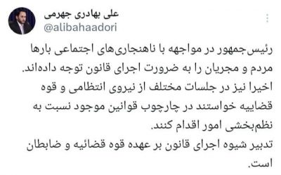 بهادری جهرمی: 🔹رئيس جمهور در مواجهه با ناهنجاریهای اجتماعی بارها مردم و مجریان را به ضرورت اجرای قانون توجه دادهاند. 🔹اخیرا نیز در جلسات مختلف از نیروی انتظامی و قوه قضاییه خواستند در چارچوب قوانین موجود نسبت به نظمبخشی امور اقدام کنند. 🔹تدبیر شیوه اجرای قانون بر عهده قوه قضائیه و ضابطان است.