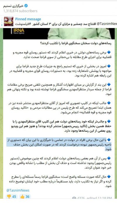 تسنیم: برخی افراد در دولت در تماسی با خبرگزاری با این بیان که برای آغاز مجدد گشت ارشاد، دستوری از ناحیه رئیسجمهور نبوده درخواست کردند که در صورت امکان این بخش حذف شود.