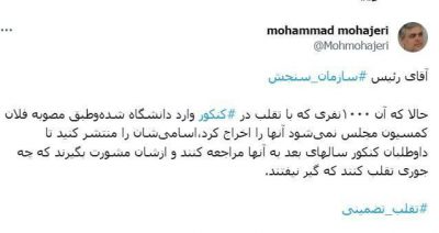 : 🔹️ اسامی متقلبان کنکور را منتشر کنید تا داوطلبان کنکور سالهای بعد به آنها مراجعه کنند و ازشان مشورت بگیرند که چه جوری تقلب کنند که گیر نیفتند.