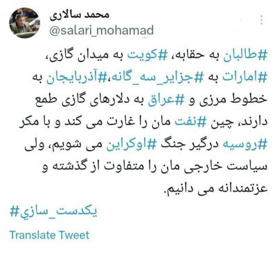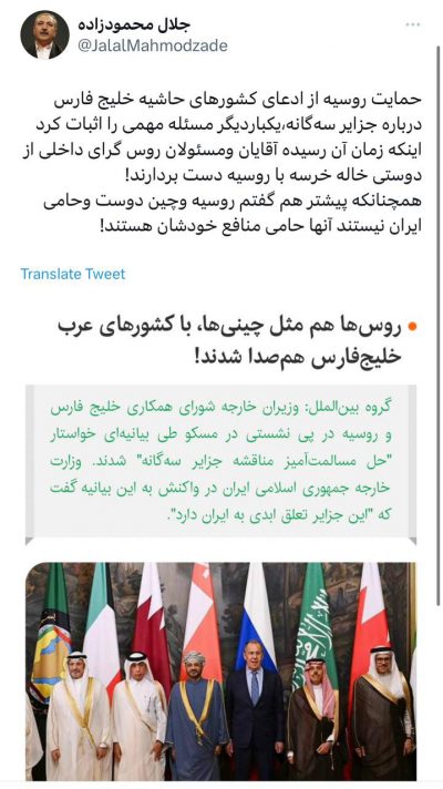 روسیه و چین دوست و حامی ایران نیستند آنها حامی منافع خودشان هستند! محمودزاده طی متنی خطاب به مسئولان روس گرای داخلی نوشت؛ 🔹حمایت روسیه از ادعای کشورهای حاشیه خلیج فارس درباره جزایر سهگانه، یکبار دیگر مسئله مهمی را اثبات کرد اینکه زمان آن رسیده آقایان و مسئولان روس گرای داخلی از دوستی خاله خرسه…