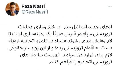 رضا نصرى، کارشناس مسائل بینالملل : ادعای جدید اسرائیل صرفاً یک زمینهسازی است تا بستر حقوقی لازم برای قراردادن سپاه در فهرست سازمانهای تروریستی اتحادیه را فراهم كند