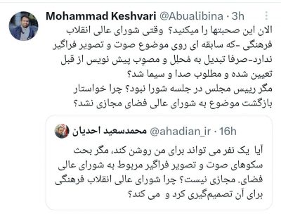 انتقادات از مصوبه شورایعالی انقلاب فرهنگی مبنی بر سلب اختیار از دولت و سپردن نظارت بر شبکه نمایش خانگی به صداوسیما ادامه دارد. محمدسعید احدیان دستیار رییس مجلس با انتقاد از روند تصویب طرح در شورایعالی انقلاب فرهنگی نوشت: آیا یک نفر می تواند برای من روشن کند، مگر بحث سکوهای صوت و تصویر فراگیر…
