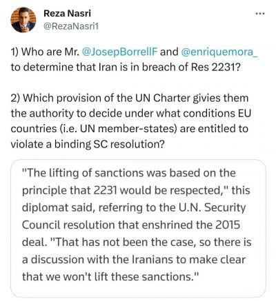 رضا نصری، کارشناس مسائل بینالملل: 🔹۱) آقایان بورل و مورا در چه جایگاهی هستند که بتوانند رأی دهند ایران در نقض قطعنامه ۲۲۳۱ شورای امنیت قرار دارد؟ 🔹۲) کدام بند از منشور سازمان ملل به این آقایان این اختیار را نیز داده تا تعیین کنند تحت چه شرایطی کشورهای عضو اتحادیه اروپا (اعضایی از سازمان…