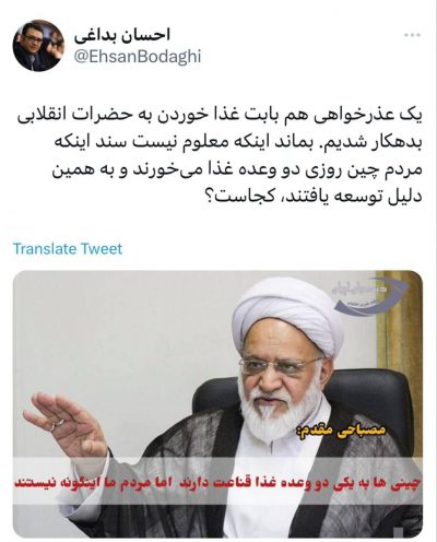 مردم از مسئولان بابت خوردن غذا عذرخواهی کنند! یک عذرخواهی هم بابت غذا خوردن به حضرات انقلابی بدهکار شدیم. احسان بداغی، فعال رسانه ای در توییتی نوشت : یک عذرخواهی هم بابت غذا خوردن به حضرات انقلابی بدهکار شدیم. بماند اینکه معلوم نیست سند اینکه مردم چین روزی دو وعده غذا میخورند و به همین…
