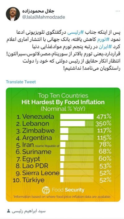 جلال محمودزاده نماینده مهاباد در واکنش به رتبه پنجم ایران در بین کشورهای دارای بدترین تورم غذایی طی متنی کوتاه نوشت؛ 🔹پس از اینکه جناب رئیسی در گفتگوی تلویزیونی ادعا نمود تورم کاهش یافته است، بانک جهانی با انتشار آماری اعلام کرد ایران در رتبه پنجم تورم مواد غذایی دنیا قرار دارد، یعنی تورم بالاتر…