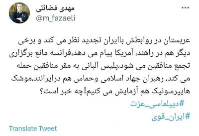 مهدی فضائلی عضو دفتر حفظ و نشر آثار رهبر انقلاب با انتشار مطلبی در حساب کاربری خود در توئیتر نوشت: 🔹عربستان در روابطش با ایران تجدید نظر می کند و برخی دیگر هم در راهند، آمریکا پیام می دهد، فرانسه مانع برگزاری تجمع منافقین می شود، پلیس آلبانی به مقر منافقین حمله می کند، رهبران…