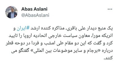 سردبیر اخبار برونمرزی ایرنا: 🔹یک منبع دیدار علی باقری، مذاکره کننده ارشد ایران و انریکه مورا، معاون سیاست خارجی اتحادیه اروپا را تایید کرد و گفت که این دو مقام طی امشب و فردا در دوحه قطر درباره «برجام و سایر موضوعات بین المللی» گفتگو می کنند.
