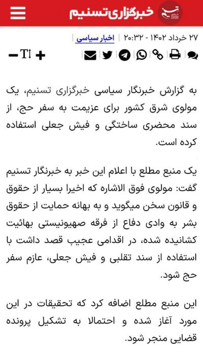 🔹خبرگزاری تسنیم در گزارشی بدون نام بردن از مولوی عبدالحمید، ادعا کرد: یک مولوی مشهور شرق کشور قصد داشت با استفاده از سند تقلبی و فیش جعلی، عازم سفر حج شود. 🔹چندی پیش دفتر امام جمعه اهل سنت زاهدان خبر داد بود که مولوی عبدالحمید از سفر به حج منع شده است.