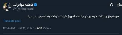 سخنگوی دولت: واردات خودرو در جلسه هیات دولت به تصویب رسید مهاجرانی، سخنگوی دولت در شبکه ایکس نوشت: موضوع واردات خودرو در جلسه امروز هیات دولت به تصویب رسید. جلسه هیات دولت به ریاست رئیس جمهور و با حضور اعضای کابینه از ساعت ۷ صبح در محل نهاد ریاست جمهوری آغاز شده است.