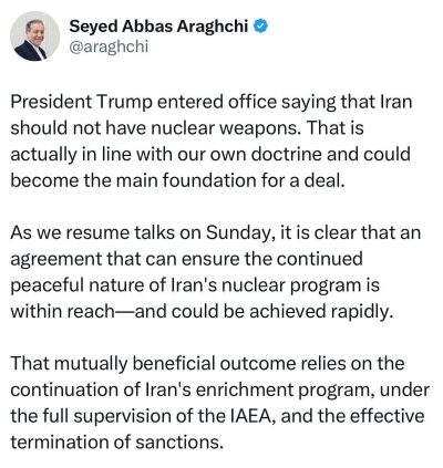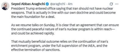 عراقچی: عاریبودن ایران از سلاح هستهای میتواند به پایه اصلی توافق بین ایران و آمریکا تبدیل شود عراقچی وزیر امور خارجه کشورمان در شبکه اجتماعی خطاب به ترامپ نوشت: عاریبودن ایران از سلاح هستهای میتواند به پایه اصلی توافق بین ایران و آمریکا تبدیل شود توافقی که بتواند ماهیت صلحآمیز برنامه هستهای ایران را تضمین…