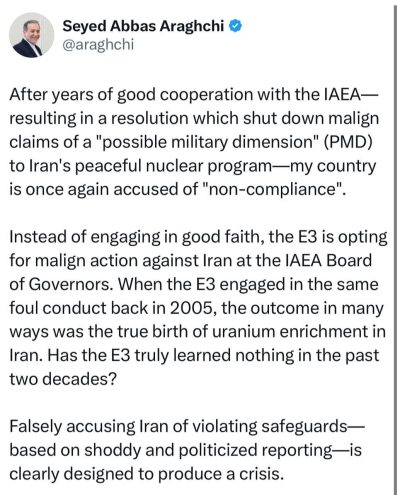 ایران در برابر هرگونه نقض حقوق خود، واکنشی قاطع نشان خواهد داد. سید عباس عراقچی امروز جمعه ۱۶ خرداد ماه در مطلبی در شبکه اجتماعی ایکس در این ارتباط نوشت: پس از سالها همکاری خوب با آژانس بینالمللی انرژی اتمی — که به صدور قطعنامهای منجر شد که ادعاهای مغرضانه دربارهی «ابعاد نظامی احتمالی» (PMD)…