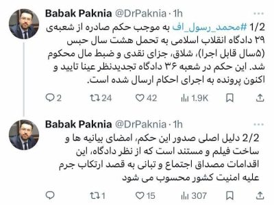 🔹شعبه ۲۹ دادگاه انقلاب اسلامی تهران محمد رسولاف، نویسنده و کارگردان شناختهشده ایرانی را به ۸ سال زندان ، شلاق، جزای نقدی و ضبط مال محکوم کرده است. 🔹بابک پاک نیا وکیل نوشت: این حکم در دادگاه تجدیدنظر عینا تأیید و اکنون برای اجرای احکام ارسال شده است.
