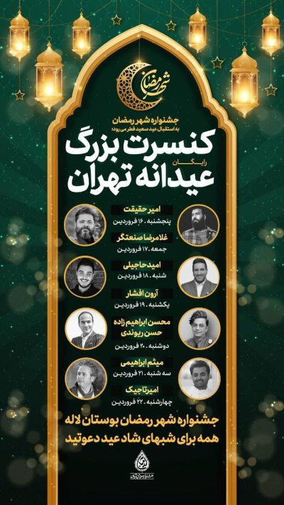 🎙کنسرت بزرگ عیدانه تهران 🔸 با حضور: 👤امیر حقیقت 👤غلامرضا صنعتگر 👤 امید حاجیلی 👤 آرون افشار 👤محسن ابراهیم زاده 👤 حسن ریوندی 👤میثم ابراهیمی 👤 امیر تاجیک 📍تهران، بوستان لاله #چند_ثانیه
