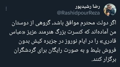 اعلام آمادگی رضا رشیدپور برای برگزاریکنسرت عباس قادری در کیش
