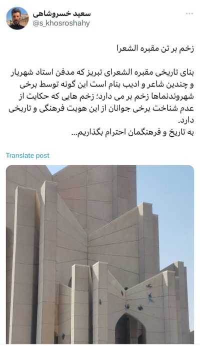 سعید خسروشاهی فعال رسانه ای با انتشار این تصویر در شبکه ایکس نوشت: 🔹بنای تاریخی مقبره الشعرای تبریز که مدفن استاد شهریار و چندین شاعر و ادیب بنام است این گونه توسط برخی شهروندنماها زخم بر می دارد؛ زخم هایی که حکایت از عدم شناخت برخی جوانان از این هویت فرهنگی و تاریخی دارد. به…