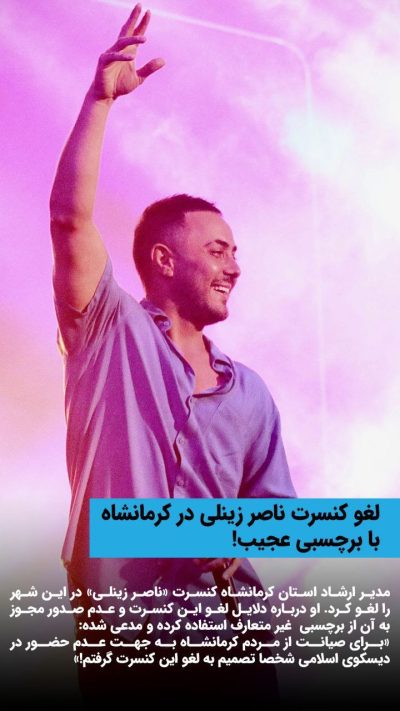🔹مدیر ارشاد استان کرمانشاه کنسرت «ناصر زینلی» در این شهر را لغو کرد. او درباره دلایل لغو این کنسرت و عدم صدور مجوز به آن از برچسبی غیر متعارف استفاده کرده و مدعی شده: «برای صیانت از مردم کرمانشاه به جهت عدم حضور در دیسکوی اسلامی شخصا تصمیم به لغو این کنسرت گرفتم!»