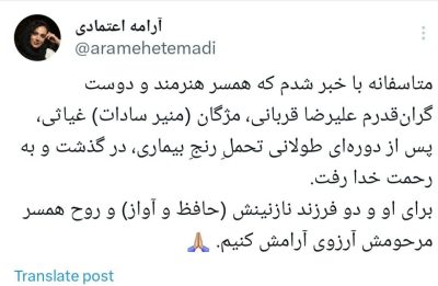 🔹منیر سادات غیاثی (مژگان) همسر علیرضا قربانی پس از یک دوره طولانی درمانی، درگذشت.