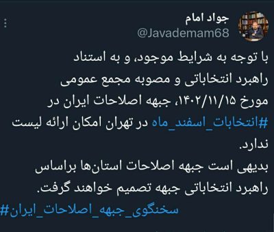 🔹با توجه به شرایط موجود، و به استناد راهبرد انتخاباتی و مصوبه مجمع عمومی مورخ ۱۴۰۲/۱۱/۱۵، جبهه اصلاحات ایران در انتخابات اسفند ماه در تهران امکان ارائه لیست ندارد. 🔹بدیهی است جبهه اصلاحات استان ها براساس راهبرد انتخاباتی جبهه تصمیم خواهند گرفت.